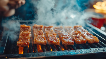 Experience the enticing aroma of sizzling grilled meat as smoke wafts through the air, showcasing tender strips cooking on a barbecue grill, ideal for food lovers.