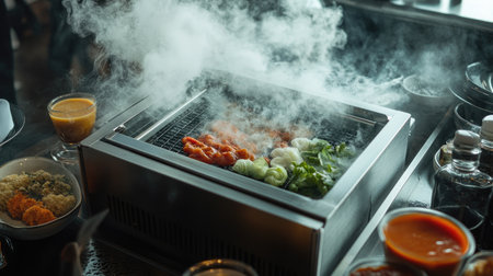 A delightful mookata grill in action, with steam and smoke rising, and a variety of sauces and side dishes arranged artfully on the table, enhancing the dining experience