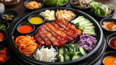 A beautifully arranged spread featuring grilled meat surrounded by fresh vegetables and an array of traditional Korean side dishes, perfect for a delightful meal.