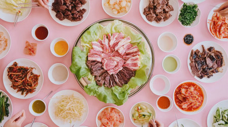 A vibrant assortment of raw meats and dipping sauces arranged beautifully on a pink tablecloth, perfect for a communal dining experience centered around fresh flavors and culinary traditions.
