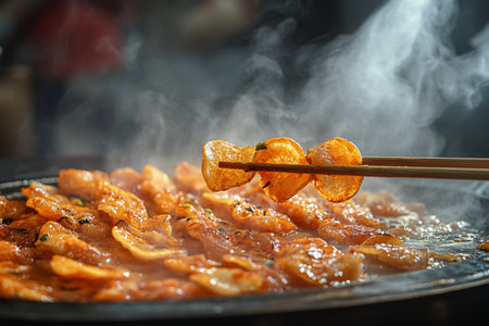 Pork slides are fresh, grilled on a hot stove and with steam rising up from the stove.Close up chopsticks are pinched with pork.