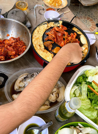 Unrecognizable man is enjoying cooking and eating Moo Ka Ta or Thai BBQ in outdoor restaurant