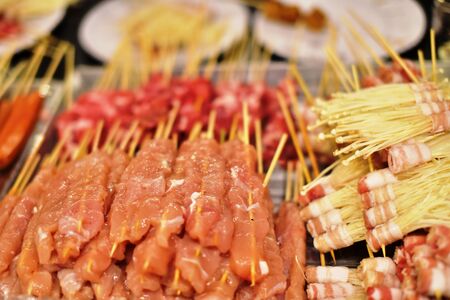 Grill barbecue on pan and hot pot street buffet thai style (selective focus).