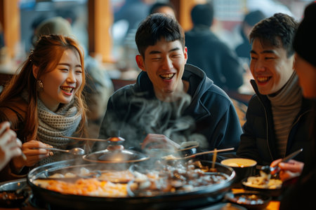 A group of Asian men and women are eating sukiyaki in a restaurant.