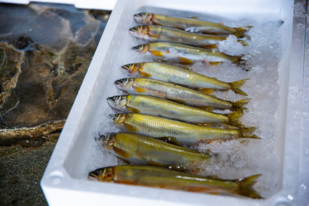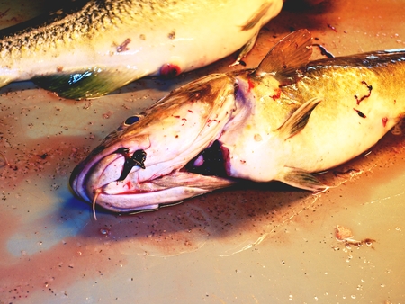 Freshly killed fish in a plastic box with a little of bloody water. Draining fish in the blood. Fish slaughterhouse or butchery