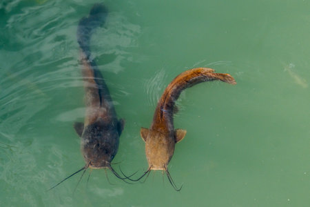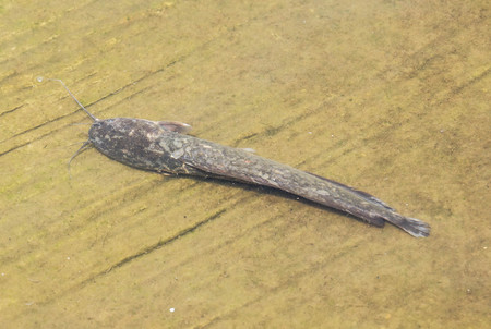 A detailed view of a freshwater fish showcasing its dark scales, prominent whiskers, and unique fin structure. Ideal for educational use and aquatic research.