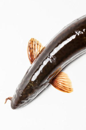 Asian-European Burbot (Lota lota lota) isolated on a white background, top view. Southern part of Lake Ladoga, Mouth of Svir river, Russia