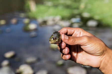 A closeup of a fishman holding a freshwater fish on the banks of a river.