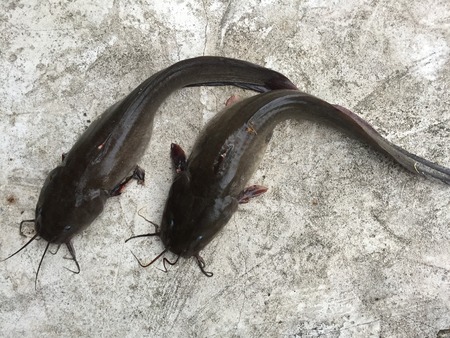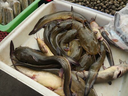 Live cat fish on a market stall. Closeup live cat fish on the market.