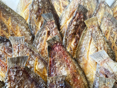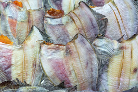 Lot of salted dried fish ocean plaice. Background of group flatfish with caviar. Stock fish Asian delicacy cuisine as an appetizer. Close-up flat lay view of prepared and ready-to-eat Pacific seafood.