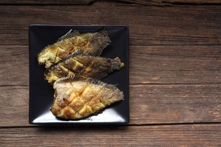 Thai crispy gourami fish , gouramy or Sepat Siam fish or Pla salid in Thai language displayed on the black pan on wooden table in the restaurant for lunch