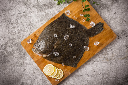 Raw lemon sole fish on ice with herbs and lemon wedges