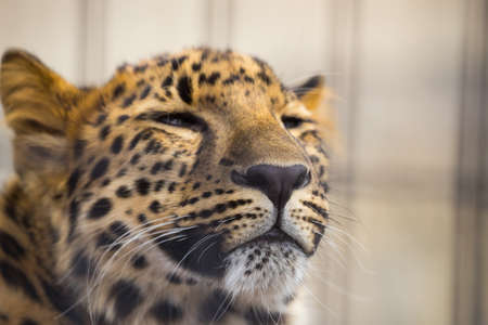 Leopard in a cage. Portrait of a wild animal.