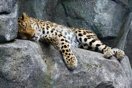 Adult male persian leopard (Panthera pardus saxicolor) sleeping in the daytime on the stones