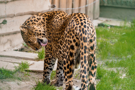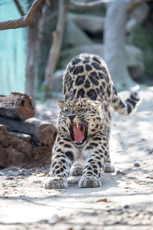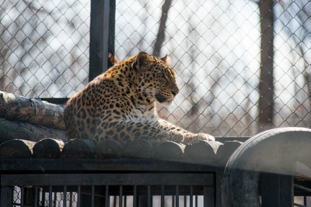 Far Eastern leopard in captivity. A beautiful adult Far Eastern leopard is in a cage. zoo