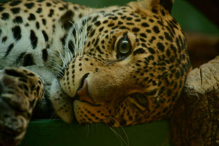 A close-up image of a majestic Leopard resting peacefully in its natural wild habitat