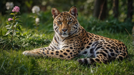 Majestic panther resting on a grass carpet. Looking for you with the look