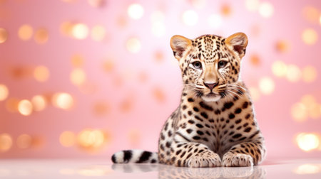 Leopard with pink hydrangea flowers in the background.