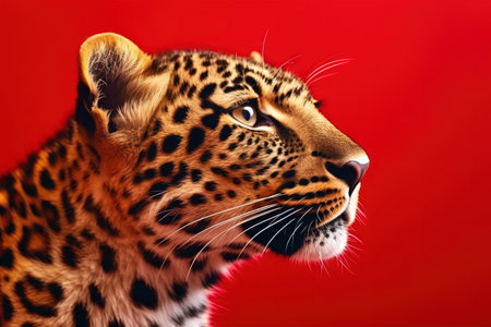 The proud face of a red-spotted powerful leopard cat, a black background muzzle in the center.
