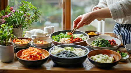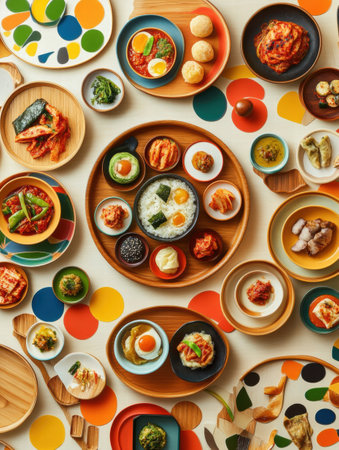 Diverse Korean dishes are artistically arranged on a table, featuring kimchi, bibimbap, steamed dumplings, and various side dishes.