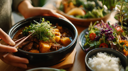 Delicious Asian-inspired meal being served on a table in a cozy setting with fresh ingredients