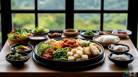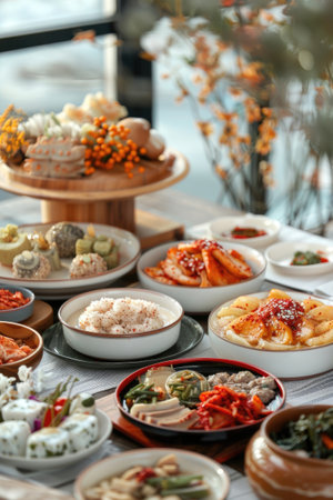 A beautifully arranged table showcases an array of traditional Korean dishes like kimchi, bibimbap, and savory dumplings, perfect for sharing.
