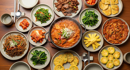 A traditional Korean table spread with kimchi, bulgogi, japchae, and colorful banchan dishes, ready to be enjoyed