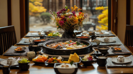 A vibrant Korean hotpot meal featuring a steaming bowl of noodles surrounded by diverse side dishes, perfect for sharing with family and friends.