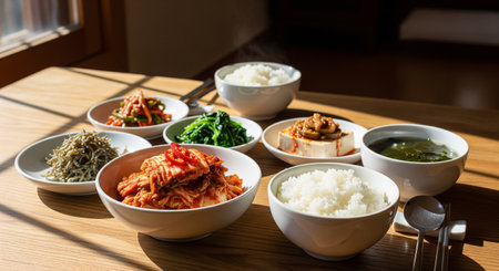 A full Korean meal setup featuring kimchi, rice, soup, and assorted side dishes arranged on a wooden table in natural sunlight