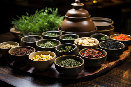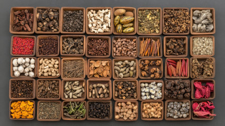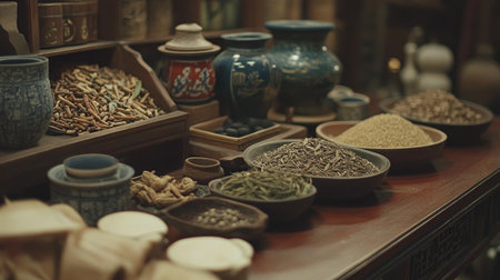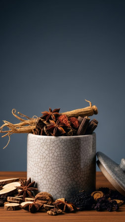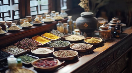 A captivating display of traditional Asian herbs and spices in earthenware and bowls, ideal for illustrating natural medicine and wellness practices.