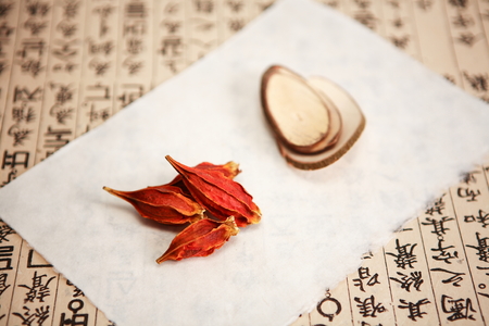 Chinese herbal medicine and book on wooden table. Chinese herbal medicine.
