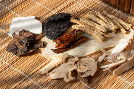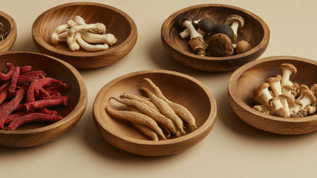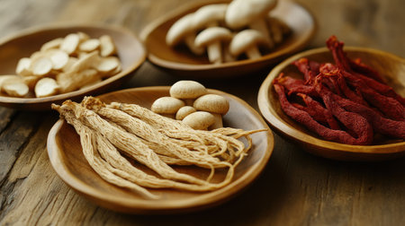 Traditional Chinese herbal medicine display with ginseng, red ginseng, and reishi mushrooms in a wooden dish. Emphasizing natural ingredients and roots for holistic health. -