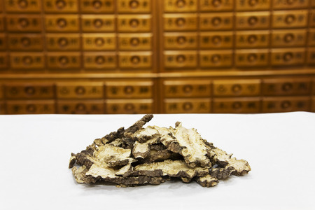 A traditional Chinese herbal medicine display with roots and leaves. No people, copy space.