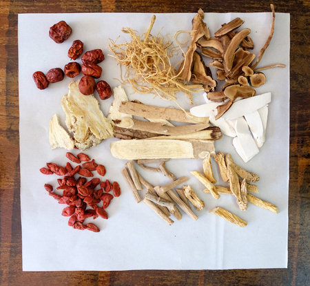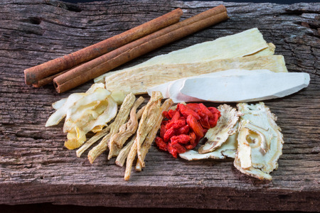 Traditional chinese herbal medicine. Ancient Chinese medicine and herbs on wooden table