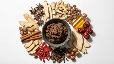 Overhead shot of traditional Chinese medicine ingredients including anise, herbs, dates, and a bowl of ground substance, and a bottle of oil on a white background.