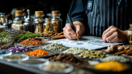A culinary artist is seen meticulously crafting new recipes surrounded by a vibrant array of spices and herbs in a rustic kitchen setting.