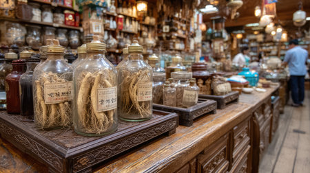 Explore a vintage herbal apothecary filled with jars of natural ingredients and roots, set in a rustic shop with warm, inviting decor.