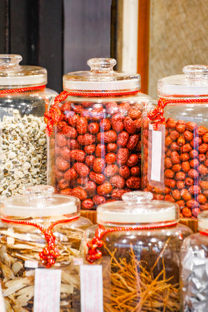 Assortment of dried plants used for traditional Chinese herbal medicine. Market in the street