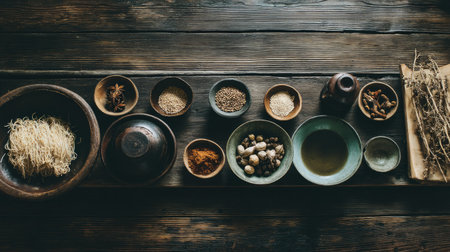 A serene and rustic vintage setting featuring herbal ingredients arranged in wooden bowls, evoking a sense of traditional medicinal practices and natural healing.