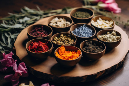 A beautifully arranged collection of spices and herbs in a traditional setting, showcasing a variety of colors and textures. This idyllic scene highlights the richness of culinary culture.