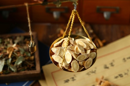 Chinese traditional herbal medicine in steelyard. Translation reads as chinese herbal therapy.
