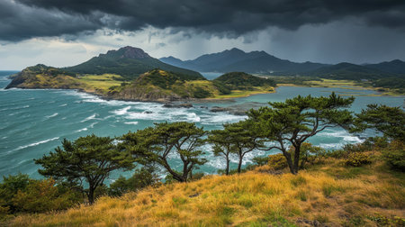 A captivating coastal scene featuring dark storm clouds hovering over turbulent waters, framed by lush greenery and hills, showcasing the raw beauty of nature.
