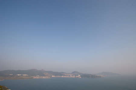 Aerial view of sea and mountain at sunset in Hong Kong.