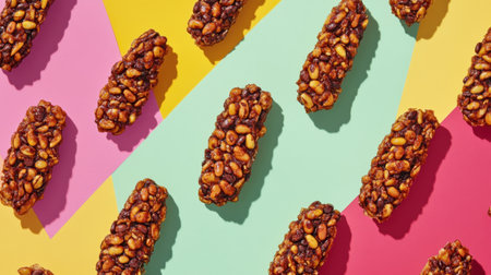 A captivating arrangement of colorful snack bars with a crunchy texture, set against a vibrant geometric background, showcasing appetizing appeal.