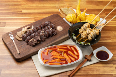Snack, Korean food, tteokbokki, sundae, fried food, fish cake, fish cake skewers, skewers, pork liver, fried eggs, deep-fried squid, seaweed roll, food, chocolate, sweet, dessert, cake, delicious,