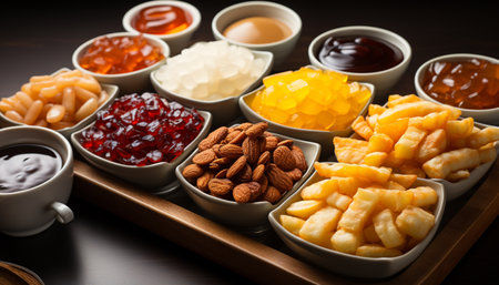 A gourmet meal fresh fruit, sweet dessert, healthy vegetable generated by artificial intelligence