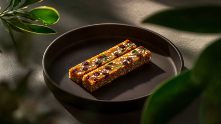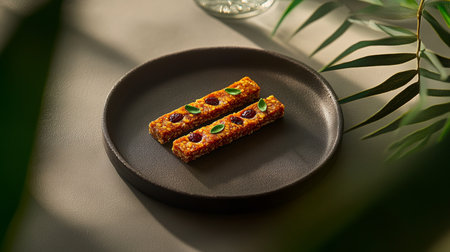 Compact mini cereal snack bars with nuts, seeds, and sprouts, crispy texture, flat lay photo emphasizing balance, comfort, and vitality.