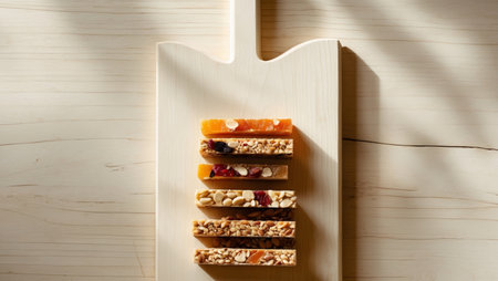 AI Generated. Stacked dried fruit and nut bars on wooden board