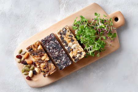 Assorted nut and seed bars with fresh microgreens on wooden board.