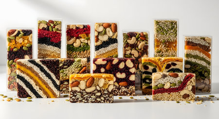 A colorful assortment of healthy, layered snack bars made from nuts, seeds, and dried fruits, displayed on a clean white surface. The bars are cut to show their ingredients, such as almonds, cashews, pumpkin seeds, and berries. This image represents healthy eating, energy snacks, and gourmet food.